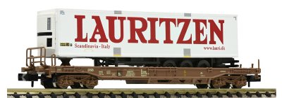 Flakvagn med semitrailer "Lauritzen". DSB.Epok V. Längd över buffertar: 102 mm.Skala N.Tillverkare: FLEISCHMANN