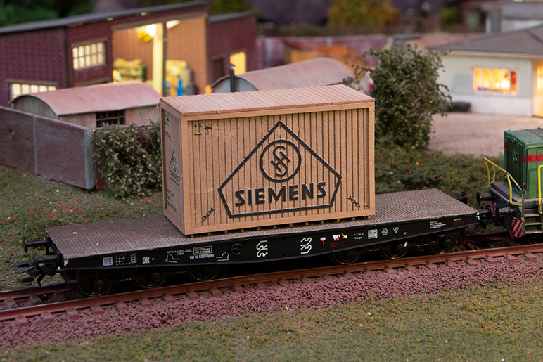 Extra tall special box with a wood look, for example as cargo for heavy transport on low-lying freight cars from various manufacturers.