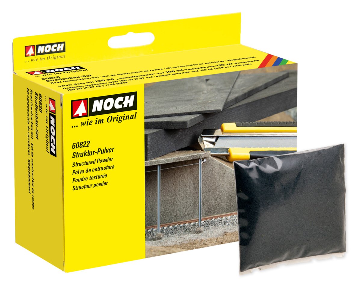 NOCH Structured Powder is extremely fine to enable you to add texture to roads, squares, walls and other components. Using a shaker, the powder is sprinkled evenly over the surface coated with NOCH Grass Glue. When the Grass Glue is dry, the surface is painted over with e.g. NOCH Structured Road Construction Paint or NOCH Acrylic Color and the area is sealed with it.