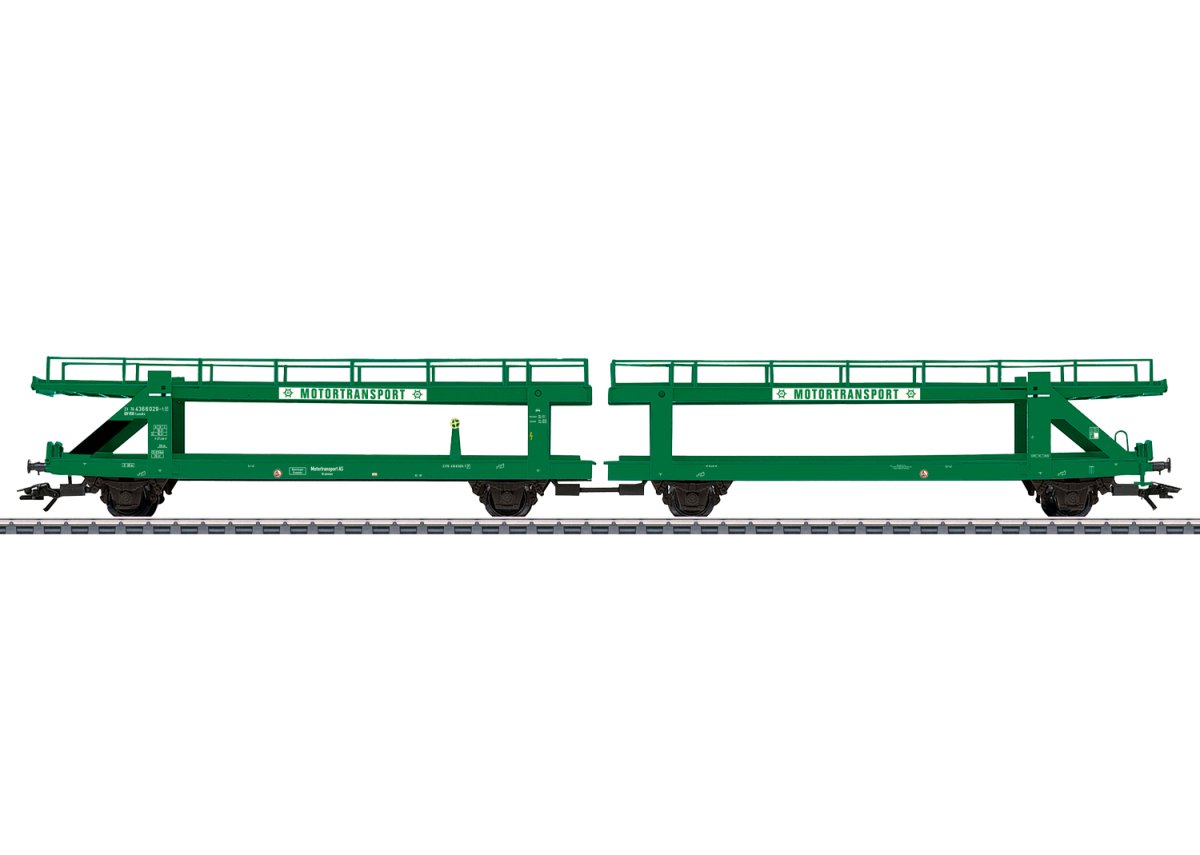 Model: Both upper decks can be lowered at the ends of the car. The lower and upper approach ramps each have two movable loading hatches. Chock blocks for model autos are included. There is a close-coupled special connection with standard coupler pockets between the car halves. Length over the buffers 31 cm.