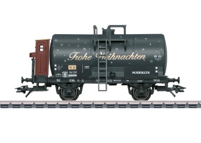 Two-axle tank car with a brakeman s cab. Here as a car in a Christmas design for the Christmas Railroad (WB).Epok III. Längd över buffertar: 102 mm.