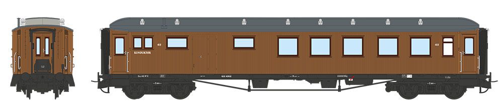 NMJ Topline+ modell av NSB 2. Kl. Kombinert Person-. Reisegods- og Konduktørvogn type BF32 412 med lanterinetak og sidemonterte takventiler.