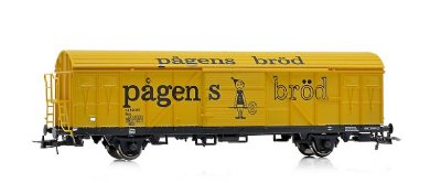 NMJ Topline modell av SJ Gre 50497 med reklame for Pågens Bröd.Topdetaljert Topline model av Gbs, "Pågens Bröd", lakkert i helgul Pågen farge med påskrifter før 1968. Modellen har alle detaljer på vognkasse av 611 typen med slette vognsider, med 8 luf
