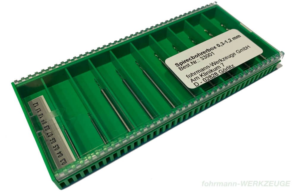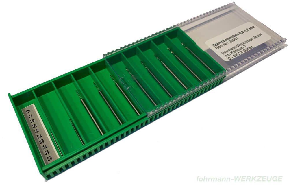Twist drill set of 10 HSS-Spirec drills with shank diam. 2.34 mm (0.3 and 0.4 mm foret with shank 1.00 mm). Supplied in a clear plastic box with a sliding lid, enabling the drills to be removed separatel. HSS-Spirec drills, for wood and metal. Especially