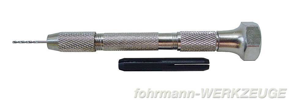 Pin Vice (Ø = 0 - 3,20 mm.)Pin vice with knurled brass handle, nickel plated, with revolving hand plateau light metal, with screw head and 2 hardened double-side collet chucks for reception of small drills. Length 105 mm, capacity 0 – 3.2 mm