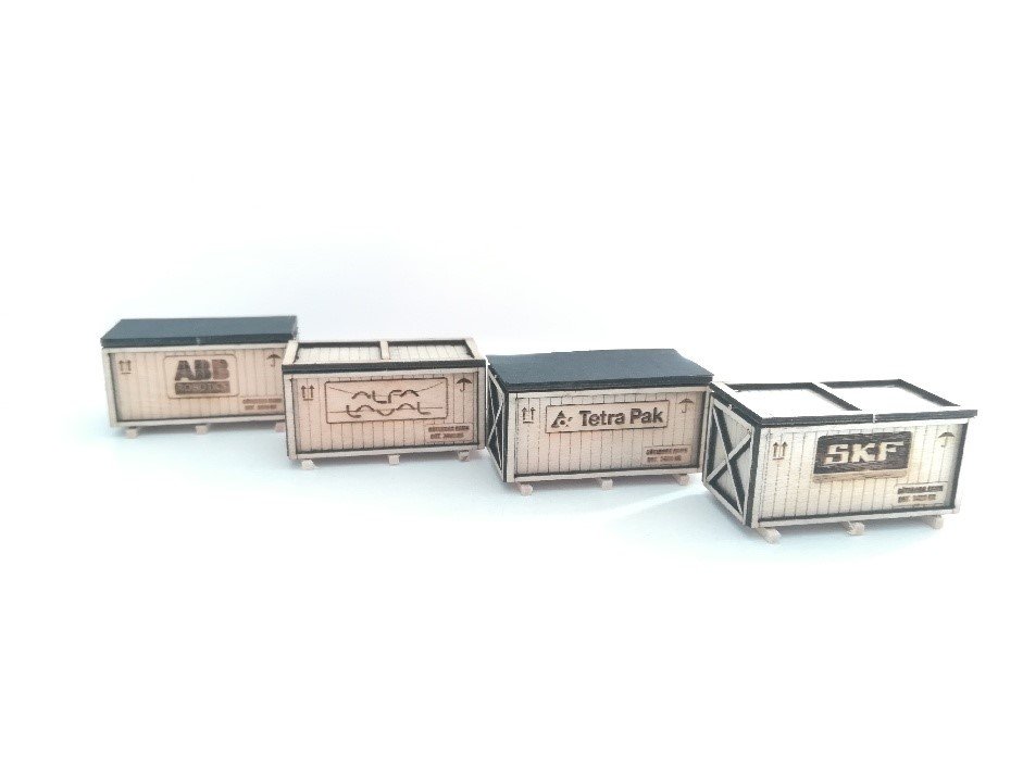 Trälådor 1 st. Alfa Laval & 1 st. Tetra PakMått: 35 x 16 x 16 mm gjorda av trä.Exklusiv artikel. Endast 100 stycken gjorda.Framtagen av Swedish Truck Models.