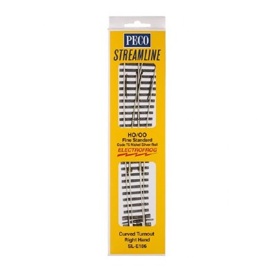 Kurvväxel, höger.Electrofrog. Radie: 1524 mm/762 mm. Längd: 255 mm.Mycket hög kvalitet. Nysilver. Skala H0 1:87. Spårvidd: 16,5 mm. Code 75 (finescale) = 1,90 mm hög rälprofil. Electrofrog växlar = metallhjärtstycke, insulfrog växlar = isolerat hj